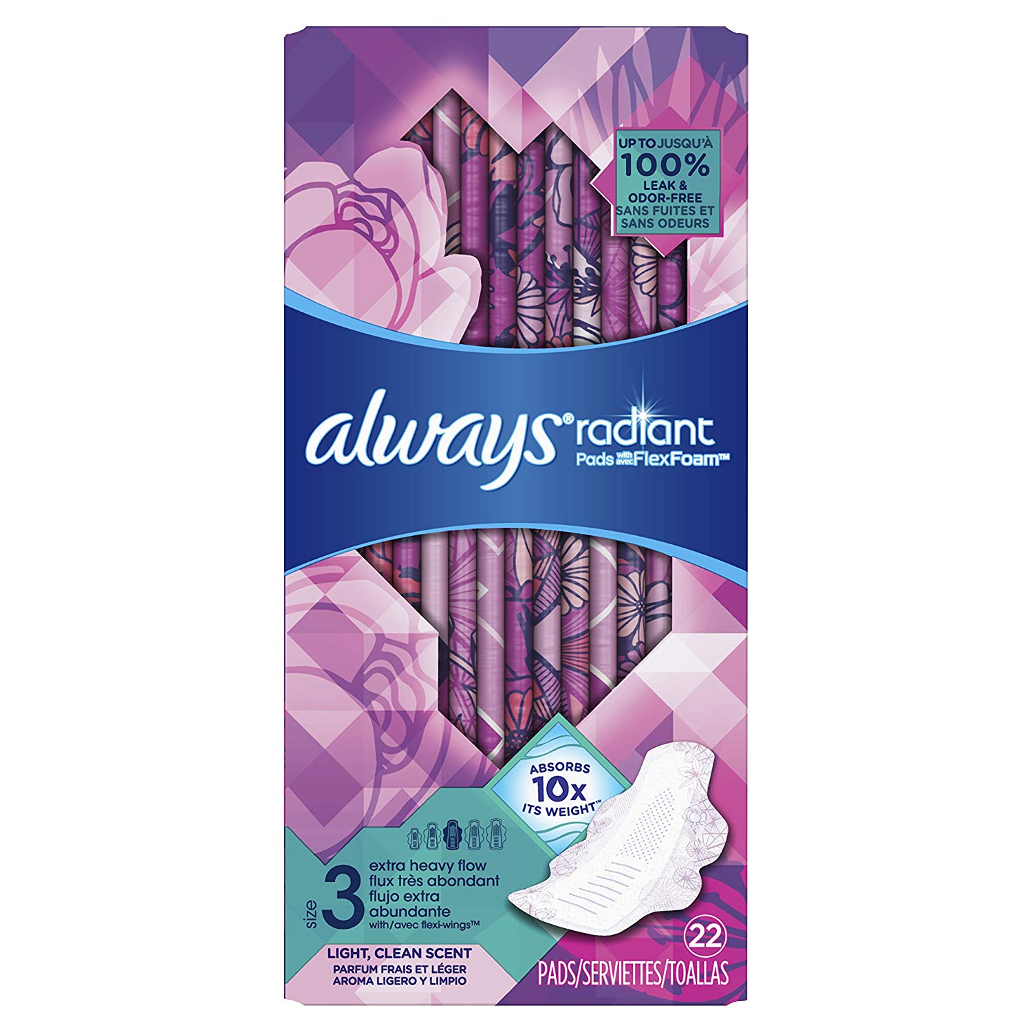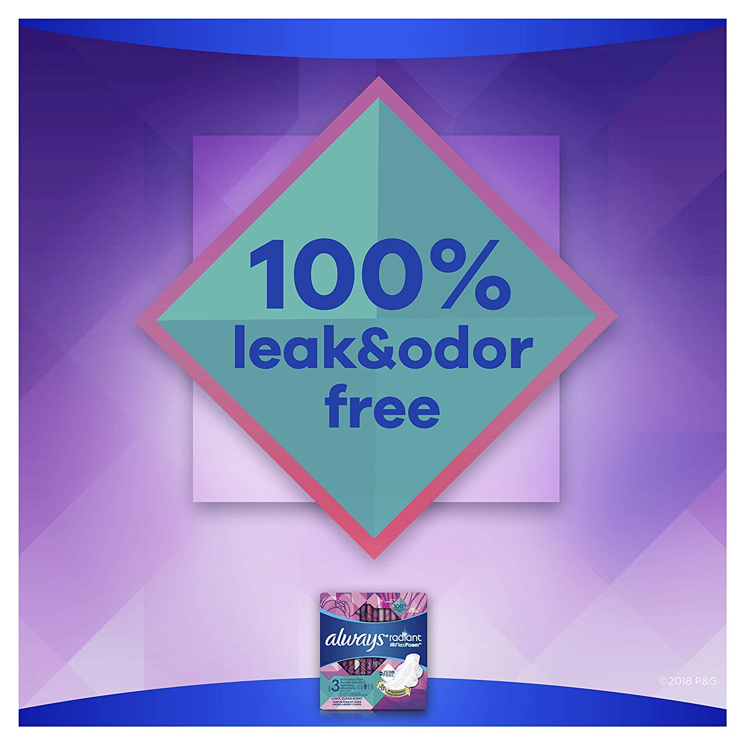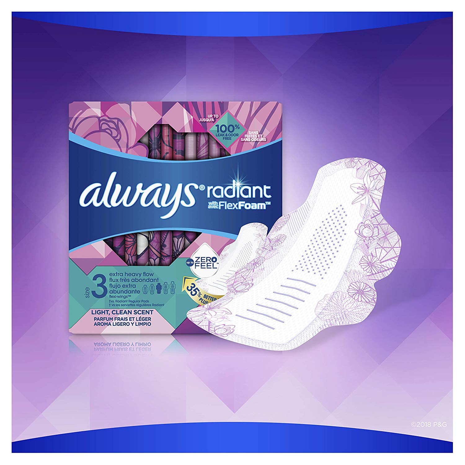 ALWAYS Radiant Extra Heavy Flow Sanitary Pads with Light Clean Scent and wings provides up to 100% protection from leakage and is odor-free. It provides all-day comfort when used. You are kept very clean and fresh and it comes with 35% larger back for your leakage absorption and is very nicely designed.