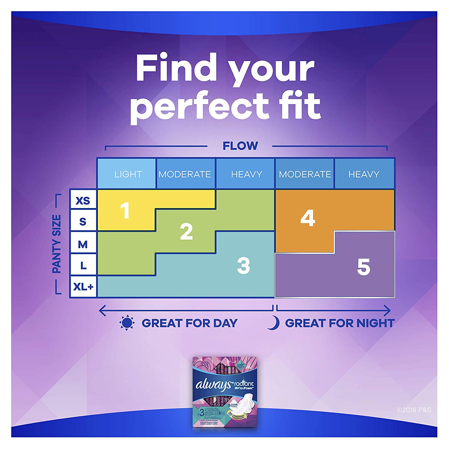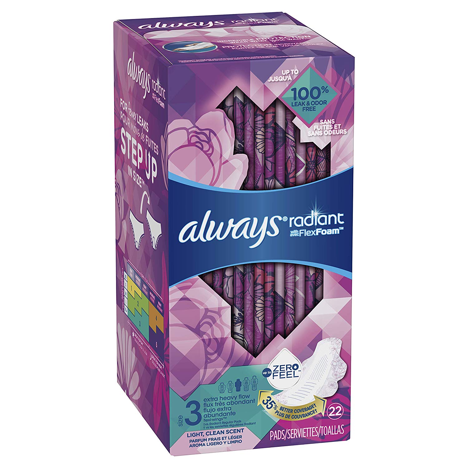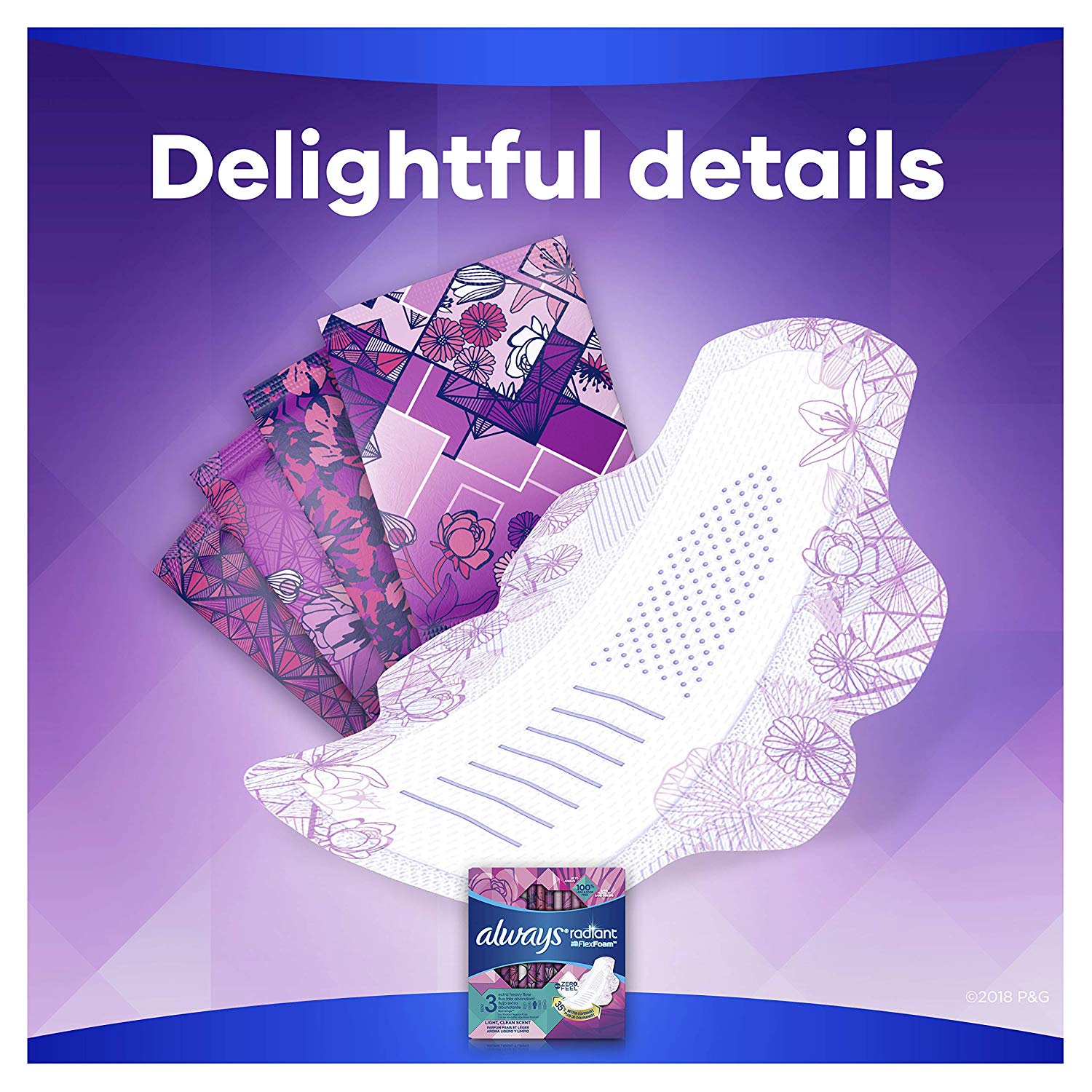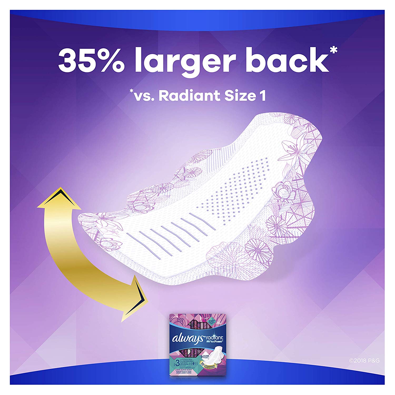 ALWAYS Radiant Extra Heavy Flow Sanitary Pads with Light Clean Scent and wings provides up to 100% protection from leakage and is odor-free. It provides all-day comfort when used. You are kept very clean and fresh and it comes with 35% larger back for your leakage absorption and is very nicely designed.